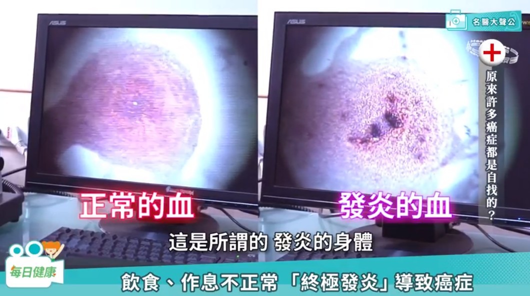 ↑羅仕寬醫師指出,正常人的血液都是通紅的,幾乎不會看到有雜質,反觀發炎的身體,血液裡面會有許多黑點。