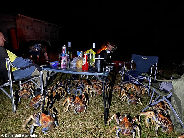 ▼9月19日晚,Luetich一家在耶誕島舉辦燒烤趴,並邀請島上的其他遊客一起玩。正當大家準備享用美食時,竟然有一大群巨大螃蟹把牠們圍了起來。那是一群椰子蟹,牠們都被嚇到,不知道該怎麼辦。
