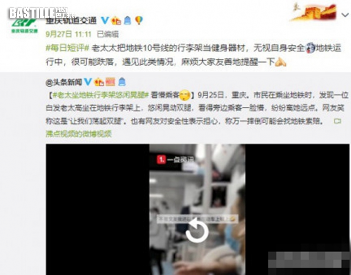 內地近日有一段影片在網上流傳,在重慶地鐵列車內,一名白髮老婦人坐在車廂上方的行李架上,悠閒晃動雙腿。重慶軌道交通工作人員表示,其行為是不文明乘車。