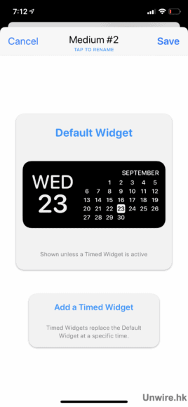 打開 Widgetsmith,裡面會看到分別有「Small」(2×2 Apps 排列)、「Medium」(4×2 Apps 排列)、「Large」(4×4 Apps 排列)的 Widget。選定你要的大小,小編今次為大家示範製作一個 Medium 的長方形日曆,先點開「Add Medium Widget」。之後會彈出一個全新的 Widget 方格,這便是待會我們的作品了。