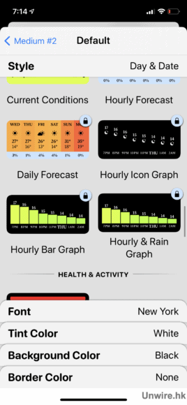 當選好字型後,便輪到選字體顏色了,Widgetsmith 預設了不少顏色讓用戶選擇,可以從中選取其一,又或拉到最尾「Custom」透過調色盤自訂顏色。