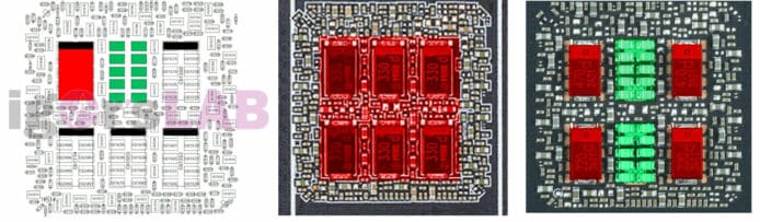 ▲中圖為使用了「6 個 POSCAP電容」的顯示卡,而右圖則為「5 個POSCAP 再加 10 個 MLCC 電容」混合使用的顯示卡。資料來源:Videocardz