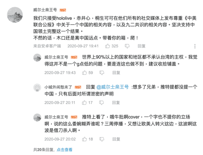 Hololive 未在 Twitter 發布相關聲明亦有引起中國網民不滿,指其只在 bilibili 出聲明並不夠誠意,有草草了事之嫌。同時間看到 Hololive 聲明的日本、台灣以及海外網民,同樣因 Hololive 沒有好好保護旗下 VTuber,反而一方面只向中國觀眾道歉而表示不滿。日本網民亦指兩名 VTuber 只直接向觀眾分享 Google Analytics 的資料,中國網民矛頭應指向 Google 而並非 VTuber 主播。