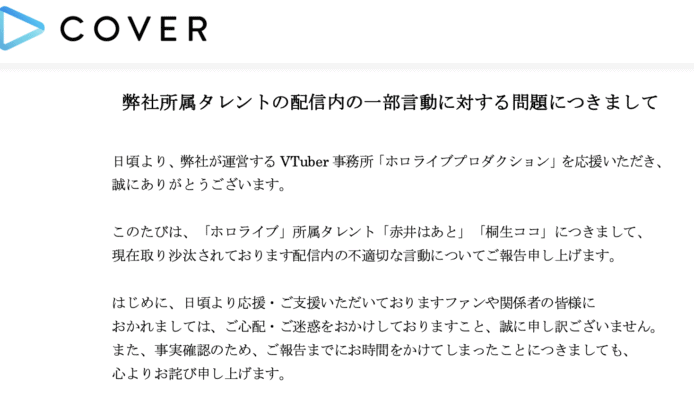 日本 COVER 株式會社旗下的虛擬偶像事務品牌 Hololive,有兩名 VTuber「赤井心」(赤井はあと)與「桐生可可」(桐生ココ),因在近日直播分享頻道內各國粉絲佔比數據時,將台灣列作國家公布而被中國網民投訴,Hololive 其後發聲明道歉並表示赤井心與桐生可可將會停業 3 周。