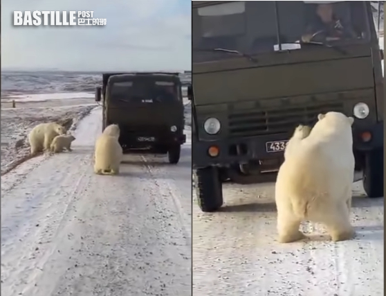 成年的北極熊接連被吸引過來,對垃圾車饒有興致的牠們,時不時走到車子正前方,雙腳站立,面部與卡車緊靠,僅隔著一層玻璃。坐在車裡的男性駕駛急忙拿起手機打電話求救,然而北極熊們早就開始爬上卡車!