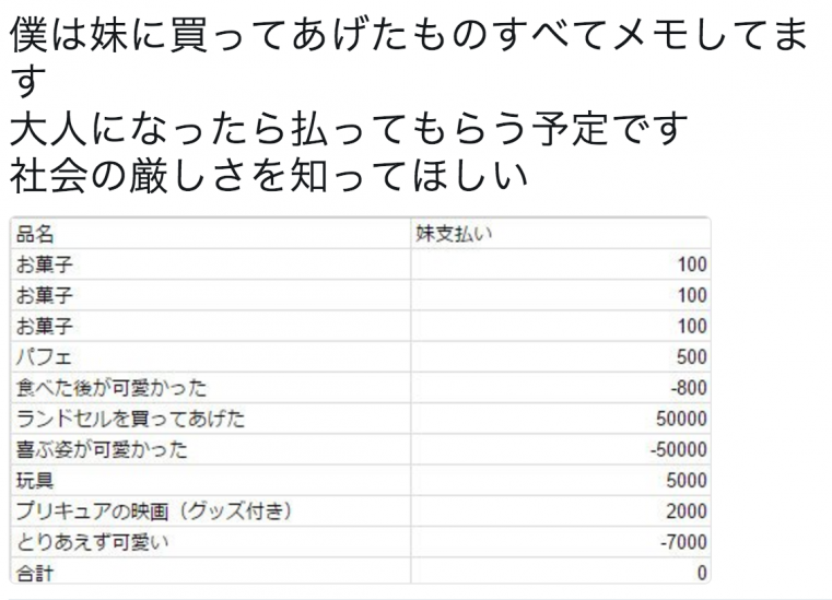 不過據說非常疼妹妹的他,其實私底下都有偷偷記帳!因為他要讓妹妹知道這個社會是殘酷的,所以每項花費他都白紙黑字的記起來,希望妹妹長大時能將這筆錢還給他!