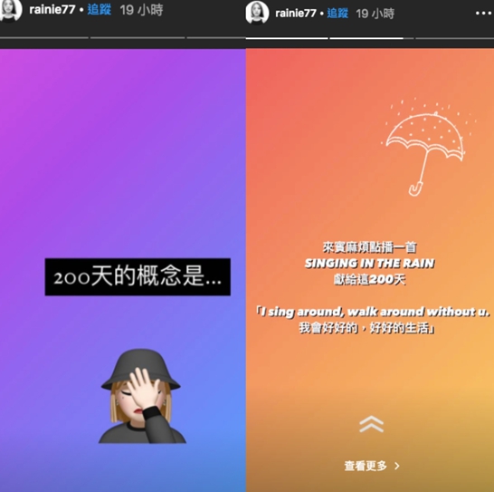 楊丞琳在限時動態中用自己的虛擬人物,閉眼摸額頭的動作寫下「200天的概念是…」,接著下一則貼文,則是用一隻雨傘的圖案配上「來賓麻煩點播一首《SINGING IN THE RAIN》獻給這200天,「I sing around, walk around without u. 我會好好的,好好的生活。」表達跟老公李榮浩分隔兩地的相思之情。事實上,兩人遠距滿100天時,楊丞琳也在限時動態表示「今天,第100天,分開太久了。」配上一個哭臉,日前,楊丞琳也曬出小米格魯的垂眼照,標記李榮浩帳號寫下「狗界李榮浩」,讓粉絲認為她用照片表達思念之情。