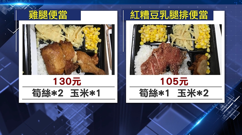 香噴噴的滷汁淋在白飯上,光看就讓人覺得肚子餓了,連鎖店鬍鬚張,不只招牌滷肉飯,許多人也會點他們家的便當,但新北有一位沈小姐,買到的卻是這樣的配菜,筍絲放了兩格,另一格是玉米,下面105元的腿排便當,則是倒過來,筍絲放了一格,其他兩格都是玉米。