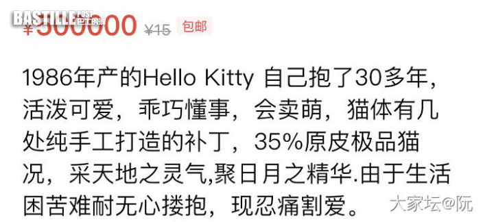近日內地網站「大家坛」有網民分享了一張來自二手網站閑魚的截圖,只見上面有一隻破爛不堪,已經發黑的陳舊公仔,而賣家留言表示「1986年生產的hello kitty,活潑可愛,乖巧懂事,會賣萌」,並表示生活困苦,忍痛割愛。