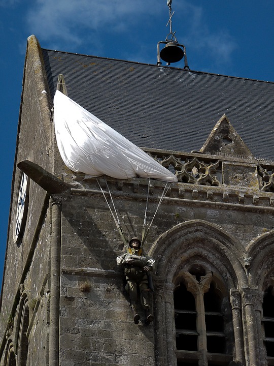 ▼二戰傘兵降落糗卡屋頂,「裝死神演技」一掛75年。圖/Pixabay