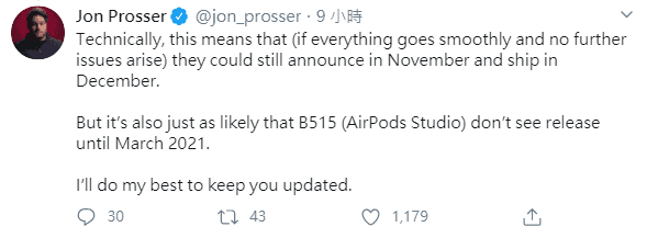 科技分析師 Jon Prosser 就在 Twitter 上發佈一則帖文指,Apple 在生產 AirPods Studio 時遇到了「障礙」,將可能會導致耳機延遲推出。而根據他的說法,某些功能將會被削減以完成產品。及後他又補充指這並非意味著 Apple 今年不會公佈 AirPods Studio,他表示在最好的情況及沒有其他問題出現的前提下,Apple 可以在 11 月向外公佈這項新產品,並在 12 月才正式推出市場,但亦有可能會推遲到明年 3 月才正式公佈。