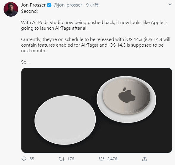 另外,貼文中亦有提及關於 AirTags 的消息,他指 AirTags 現在已經全部完成,相信 Apple 只是在等待理想的時機宣佈而已。他又從消息人士那裡得知 Apple 將在下個月發布支援 AirTags 的 iOS 14.3,因此 AirTags 很有可能會在 11 月的活動中宣布。