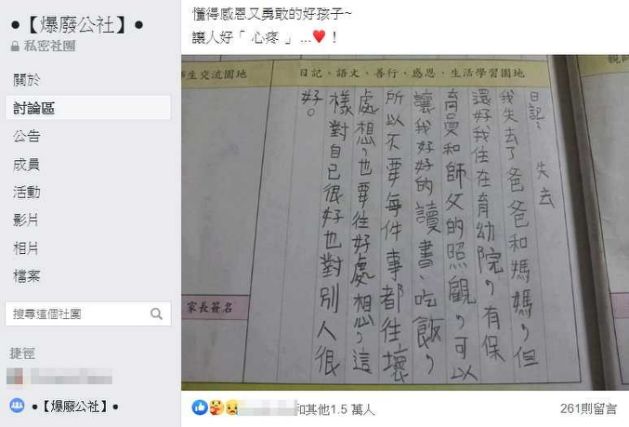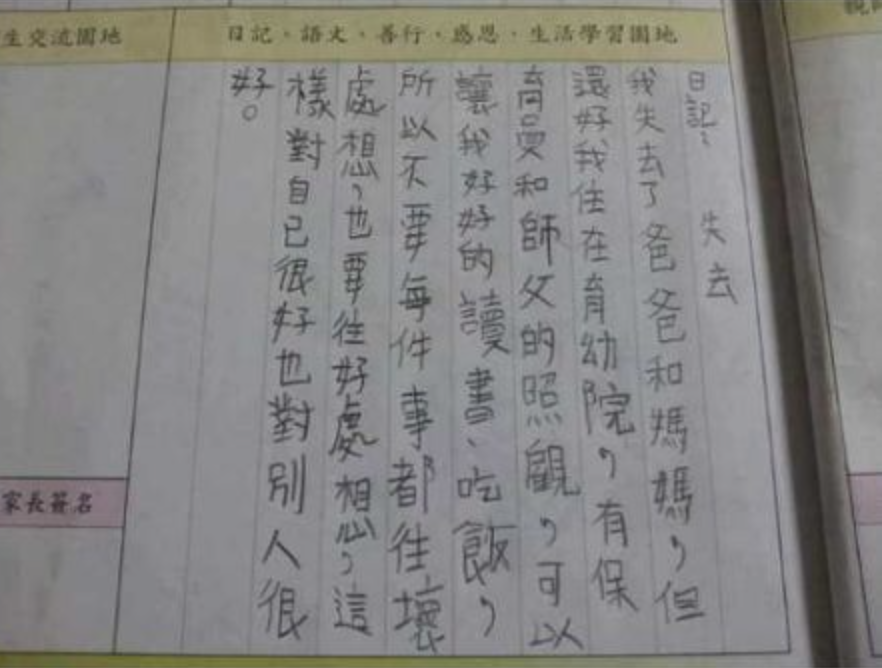 最近有位小朋友在聯絡簿上寫著一篇以「失去」為題的日記,並直接以「我失去了爸爸和媽媽」開頭而引起廣大的迴響。因為他除了立刻心懷感激表示「但還好我住在育幼院裡...」之外,下一秒更是立刻說出超早熟的感言而惹哭上萬人!