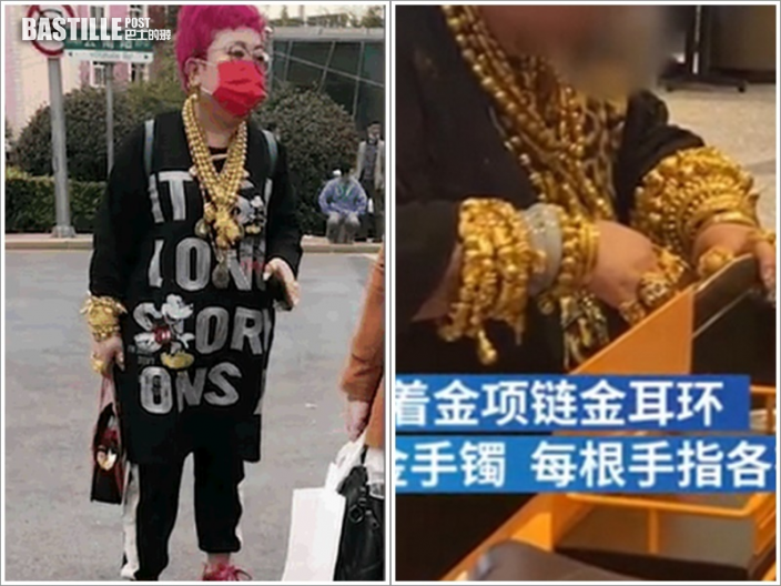 從網上的影片可見,大媽身上除了戴滿金項鍊,手上掛著十來個金手鐲,每根手指各有一個金戒指。因為戴了口罩,有網民嘲笑,可能嘴上鑲的也是金牙吧,至於腳上有沒有戴上腳鍊就不清楚。