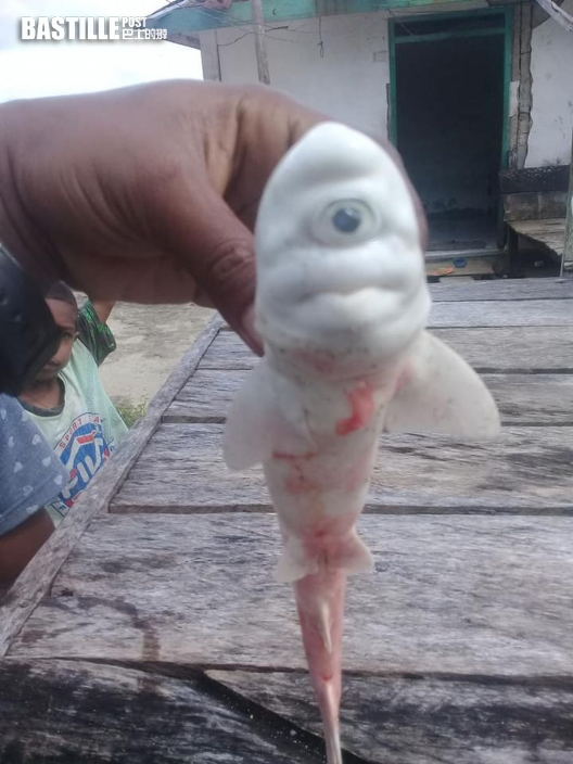 日前有印尼漁民在馬魯古省海域捕獲了一隻母鯊,當他們劏開鯊魚的腹部時,發現牠懷孕了,字宮裏有3隻小鯊魚,但是其中一隻的樣貎非常奇特,面部正中央只長了一隻眼睛,而且全身乳白色,似足神話中的怪物,讓人不寒而慄!