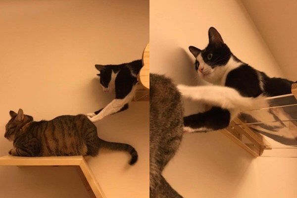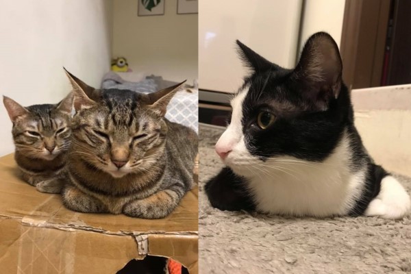 ▼除了飯糰,主人還養了一對虎斑貓母女「瓜子」和「喵喵」。飯糰經常趁牠們不注意去悄悄摸牠們,還會主動挑起紛爭。飯糰曾經一度喜歡叼走主人的襪子,就算主人將襪子放在陽台晾曬,牠都要叼走。