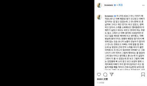 權珉娥今天在IG上連PO長文,稱遭到AOA一名隊友霸凌長達10年,就連父親去世的時候都不敢哭,而最近那名隊友的父親也去世了,引起大家對該隊友身份的猜測。