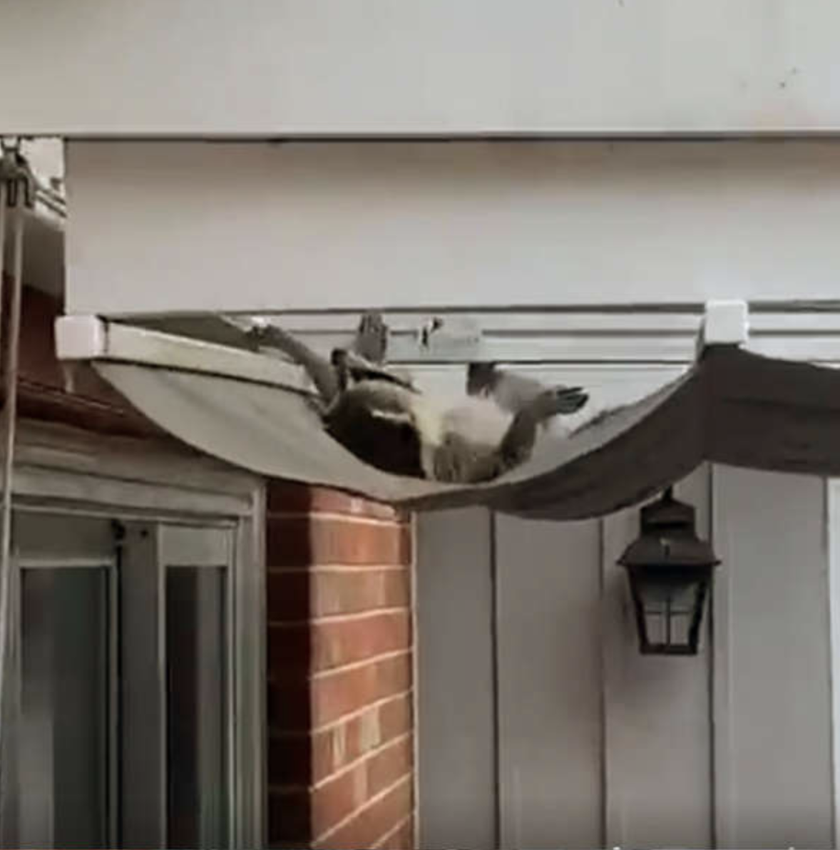 ▼Heather表示,有一天她和家人發現門口的遮陽棚上有一隻浣熊。牠看起來非常放鬆,不僅在遮陽棚上翻滾玩耍,還攤開肚皮,呈「大」字型曬太陽。Heather覺得這一幕非常有趣,連忙拿出手機拍攝起來。