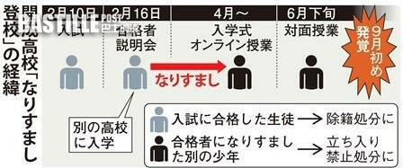 據日本媒體報導,開成高校近日傳出高一新生代考及冒名頂替入學的醜聞。一名男學生在今年2月通過入學測試被學校錄取之後,並未入讀,而是由另一名學生頂替入學。而原定4月6日開學的開成高校因為疫情爆發遲遲未能復課,改以線上授課的方式開學,直到6月29日才讓學生回到校園上課。