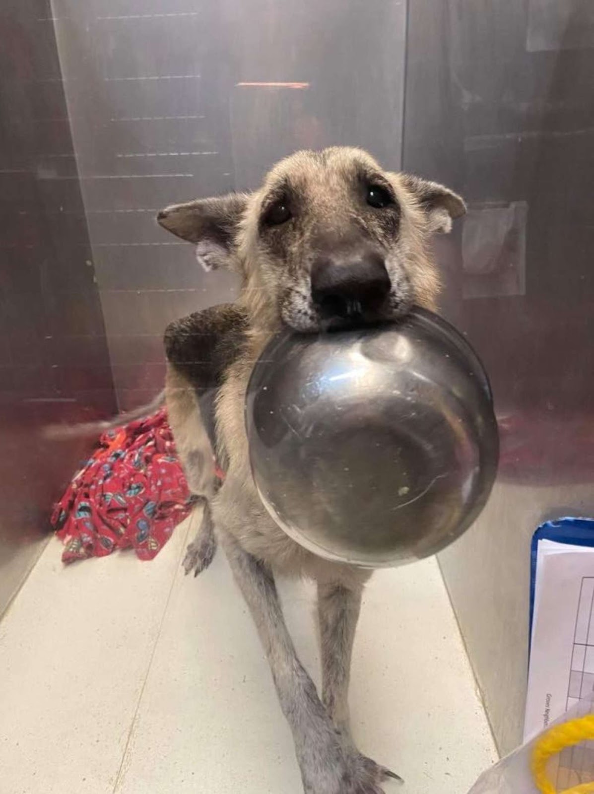 雅典娜叼著碗的表情就很像在說:「我會很乖,可以抱抱我嗎?」實在是讓人覺得既可愛又心疼,於是救援組織的志工隨後也幫雅典娜安排了一個寄養家庭,希望牠在那裡可以更快適應家犬的生活以及信任人類!
