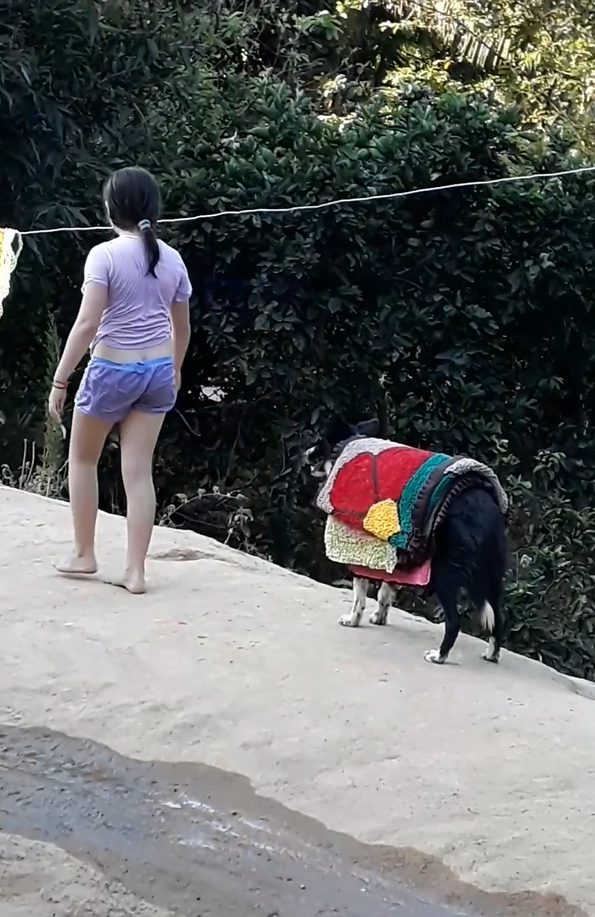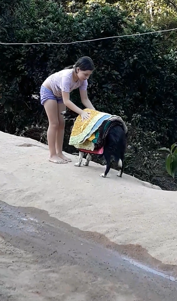 馬麻蘭妮表示,那天她請女兒泰莎(Taysa)幫忙把曬乾的地墊拿進屋,沒想到狗狗拉斯(Lassye)和帕索卡(Paçoca)也跑去外面幫忙,還擔任「行動衣架」!影片中可以看到,泰莎將地毯收下來後,就暫時披在拉斯的背上,而狗狗也乖巧地待在原地不動,等到都收完再由泰莎抱著地毯、一起進屋。