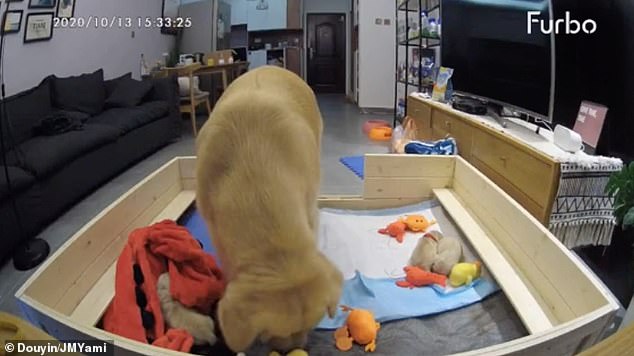 ▼從影片中可以看到,Yami非常焦急,在客廳裡走來走去。隨後牠叼來一個玩偶放在小奶狗身邊,還把玩具往小奶狗的方向推了推,那動作非常溫柔。眼看一個玩偶無法安撫小奶狗,Yami又叼了更多玩具來。