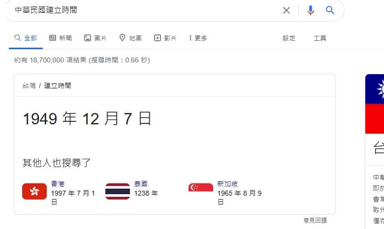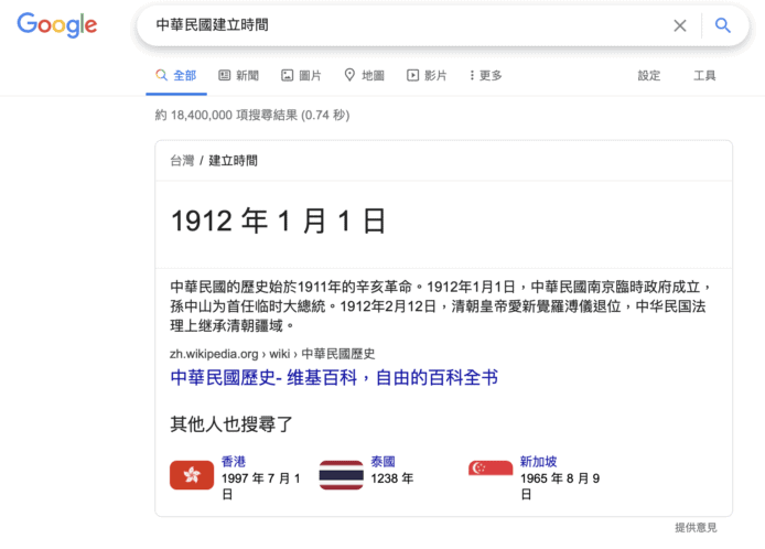 不過現是在 Google 搜尋中華民國建立時間,似乎已回復正常,顯示為 1912 年 1 月 1 日。