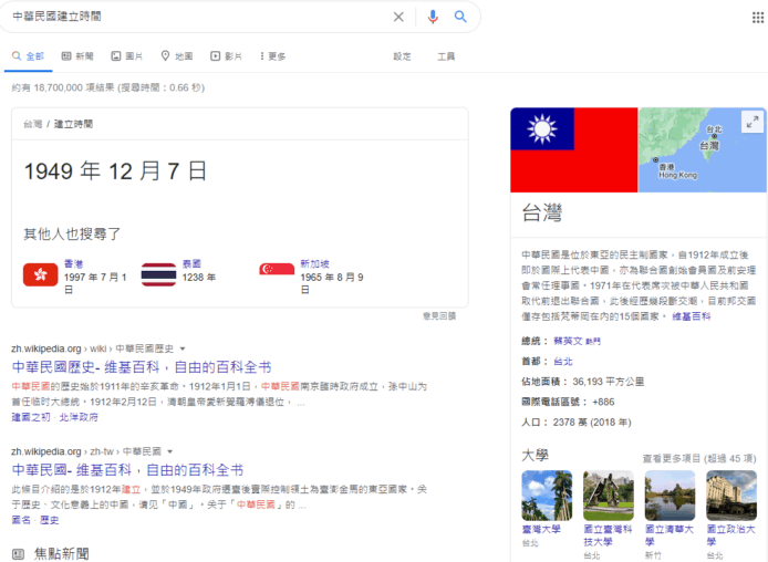 雖然中華民國是孫中山先生在 1912 年 1 月 1 日建立,但台灣的國慶日定於 10 月 10 日。而早幾日適逢台灣國慶,網民在 Google 搜尋「中華民國建立時間」,卻意外發現其顯示 1949 年 12 月 7 日,也就是中華民國政權遷往台灣的時間,引起台灣網民討論。
