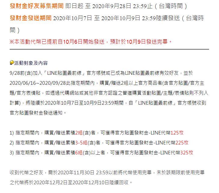 ▼以為是中樂透般的好運,其實這是LINE推出的活動:只要在9月28日前加入「LINE貼圖最前線」官方帳號或已成為LINE貼圖最前線有效好友,在6月16日到09月28日指定期間內,購買或贈送2組以上官方商品者(含官方貼圖/官方主題/官方表情貼,如透過代購網站或其他非官方認證之管道購買活動貼圖/主題/表情貼則不列入計算),將陸續於10月7日至10月9日23:59期間,自「LINE貼圖最前線」官方帳號收到官方貼圖發財金發送通知。購買獲贈送累積2組可獲得LINE代幣125枚;3-5組則有225枚;6組(含)以上一次可以拿到325枚。
