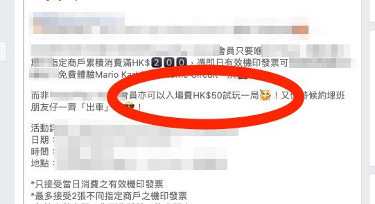 香港一家室內遊戲中心近日以 Mario Kart Live 作招徠,指遊戲中心會員只要於指定商場及商戶內累積消費滿一定金額,即可免費體驗 Mario Kart Live: Home Circuit 一次,而非會員則要支付入場費 HK$50 才可試玩。不過該商場宣傳活動並無標明同香港任天堂合作,而且更強行將 Mario 的眼睛除去,有違反著作權以及利用遊戲軟件作營利用途之嫌。