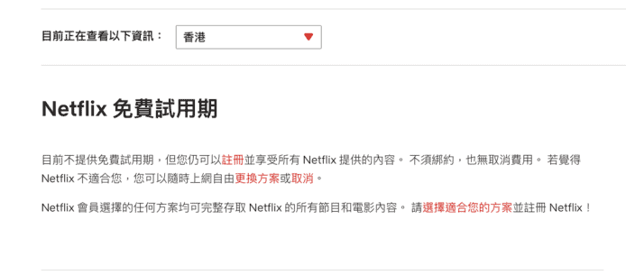 Netflix官網指出,目前不會提供免費試用,但客戶仍可以根據付費方案,享有所有 Netflix 提供的內容,並且仍然是毋須綁約、不收取取消費用,以及隨時上網自由更換或取消方案。
