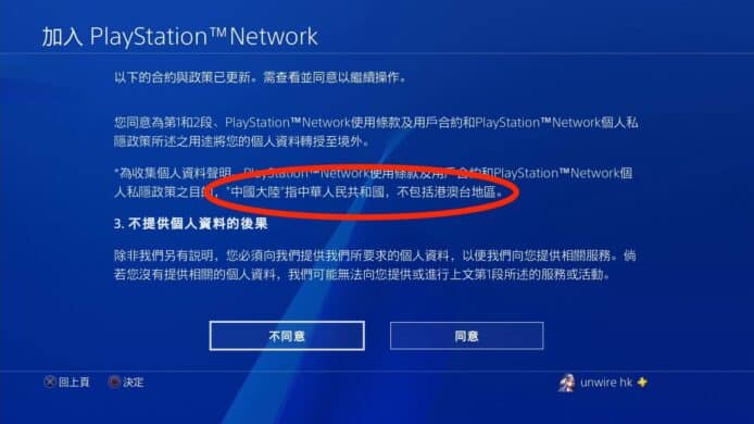 「有關條款只適用於對於居住國家/地區為中國大陸的使用者。由於PS5即將推出,「收集個人資料聲明,使用條款及用戶合約和個人私隱政策」的條款相應有所調整,因此用戶需重新接受有關條款。」