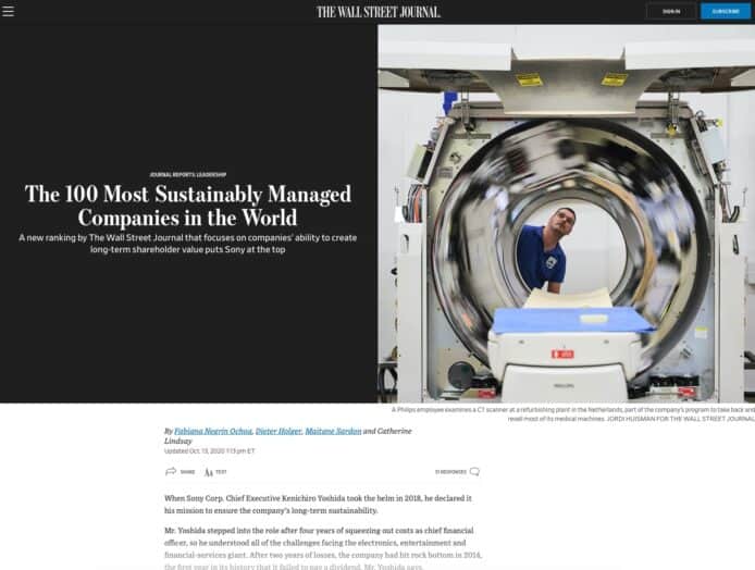《華爾街日報》(The Wall Street Journal)評估全球超過 5,500 間上市企業,最近公布全球可持續發展企業(Sustainable Management)的名單,日本公司 Sony 名列榜首,荷蘭公司飛利浦(Philips)以及美國思科(Cisco Systms)則位居第 2 及第 3 ,除此之外 LG 電子、HP 等電子企業都打入十大。