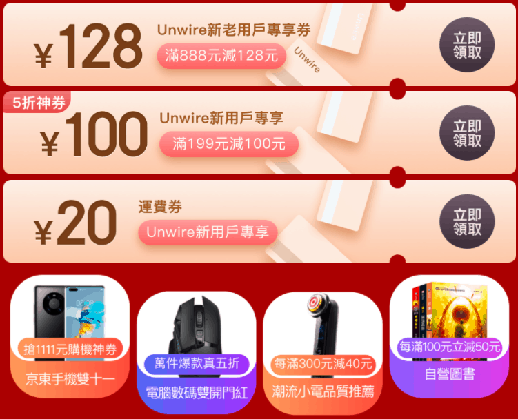 【11.11京東全球熱愛季】又豈止以上熱銷產品?整個網上購物平台有超過萬件新品上架,想用優惠價入手就要留意。因新用戶於京東成功註冊的話可享「¥188 新人大禮包」,註冊成功即可領取 ¥128 減 ¥28、¥500 減 ¥50、¥1,500 減 ¥110 三張優惠券。新舊用戶還可領取專屬 ¥888 減 ¥128 優惠券。由即日起至 11 月 13 日每日可領取 ¥399 減 ¥30 、¥499減 ¥50 及 ¥799 減 ¥100 等優惠券,下單即減。另外,一眾 unwire 讀者只要下載京東 APP 註冊成新會員,即可領取專屬的 ¥199 減 ¥100 優惠券和 ¥20 運費券。