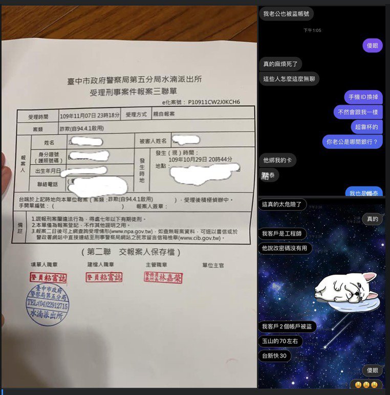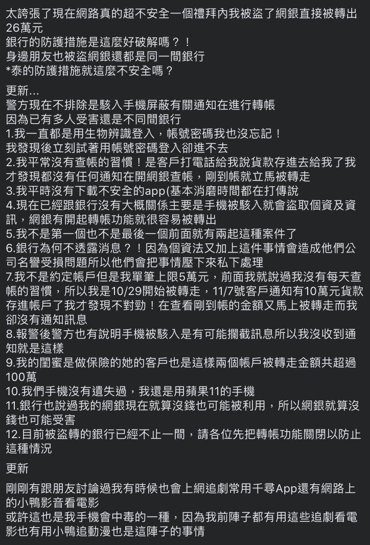 ▼這名女子在臉書社團「爆料公社二社」po文說,平時她習慣用手機網路銀行轉帳,11月7日客戶通知已匯款10萬元到她的帳戶,但她並沒有收到入帳通知。當時她心生警覺,立刻手動輸入帳號密碼,但無法登入。這時候她才發現,客戶剛剛匯入的款項已經被人盜領。她連忙請銀行調查,發現10月29日也發生過同樣的事,短短一週內她就被盜領26萬元。文末她也表示,手機中app會有導致資料外流疑慮的,是千尋、小鴨這兩款用來追劇的app。