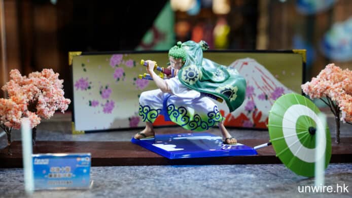 在 7 樓的《One Piece— 和之國篇》展區,穿過展區「日式小巷」,可見頭上的和傘陣,以及主角路飛等角色展品。