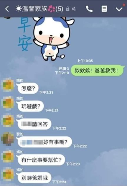 據《三立新聞網》報導,日前有媽媽在家庭群組,收到小女兒傳來的「欸欸欸!爸爸救我!」的訊息,原本還以為只是在鬧著玩,就回傳:「怎麼?玩遊戲?請回答!」但是接下來卻什麼消息都沒有,讓媽媽著急地繼續追問:「有是嗎?有什麼事要幫忙?別嚇爸媽哦!」