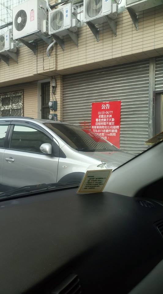 根據《ETtoday新聞雲》報導,該網友在臉書「爆料公社」貼出店家公告,可以看到上面寫著「03/20~04/?? 老闆去非洲看老虎、獅子、大象,回程時間不確定,有營業時間或任何疑問,可私訊FB老婆炸醬麵,或家老闆line詢問,四月見!」,還附上QR Code讓民眾可以掃描,由於公告超級顯眼,都會讓經過的人看一下,不過現在已經4快底了,老闆都還沒出現,讓男網友也開始疑惑老闆到底跑去哪了。