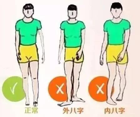可能是兩腿的膝關節向外分離,導致小腿脛骨向內翻轉一定角度。嚴重的話會形成O形腿或「內八字」。