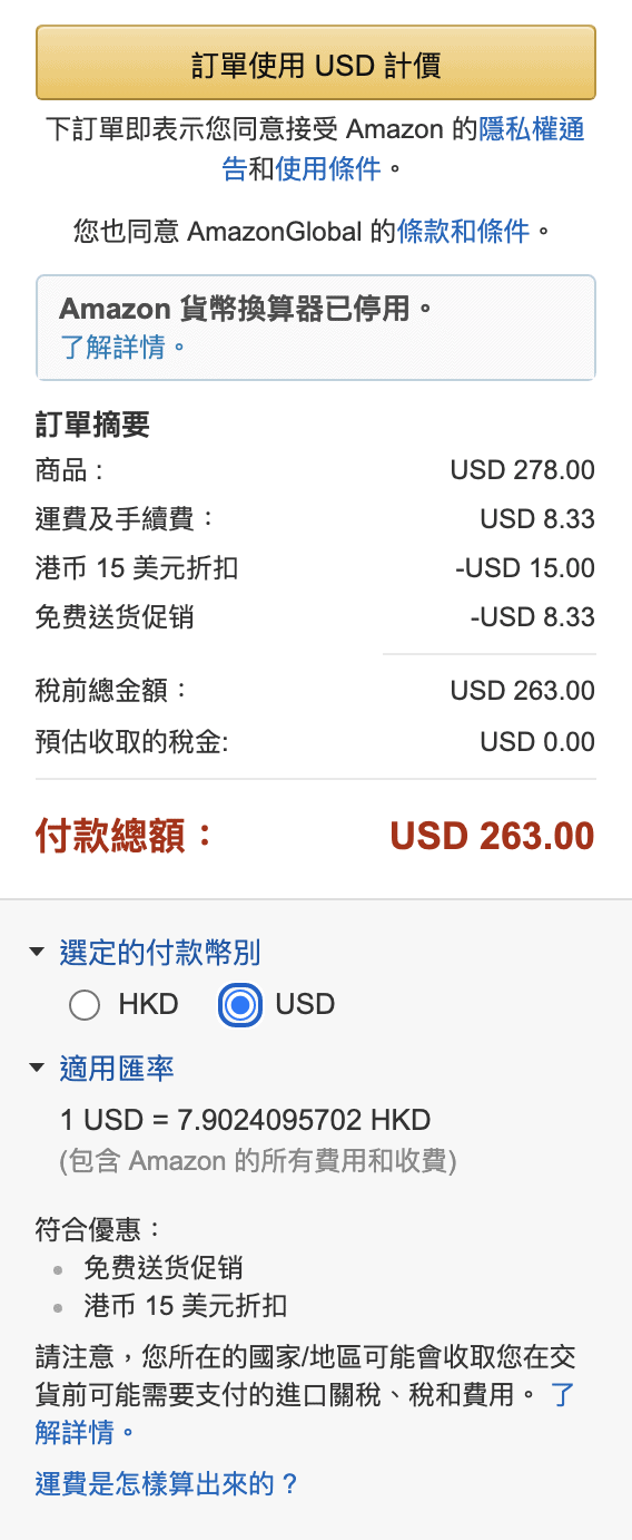 有時候雖然貨品標示的價格很低,但假如不是直送香港,而是採用集運等轉運方式去送貨,便等於在美國國內消費,需要付相當的消費稅,而且還要支付相當的運費,大家在決定購物商品前,謹記先比較連稅後及運費的價錢,才能有更全面的了解。