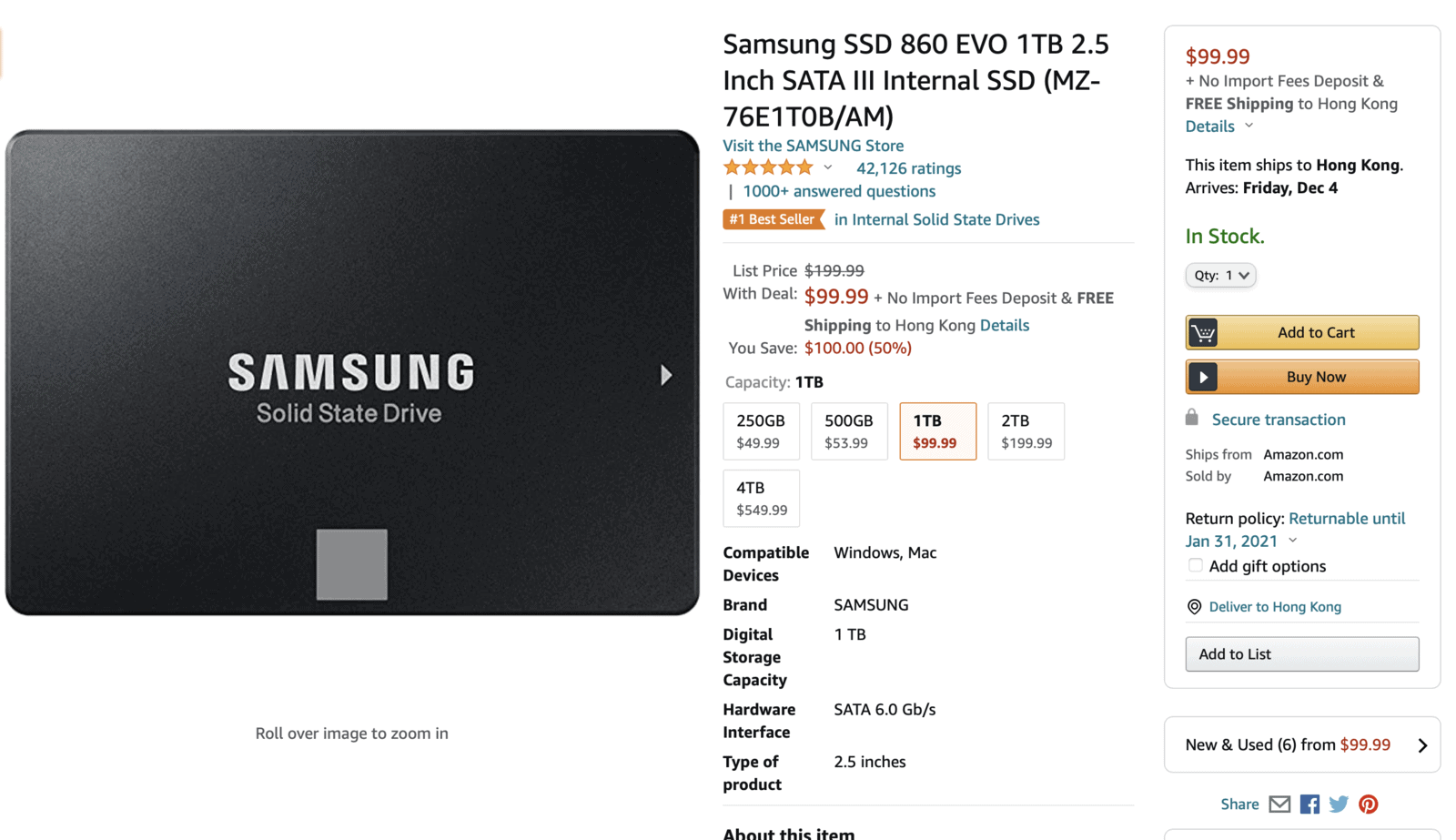 近年來推出的新款遊戲,容量愈來愈大,雖然大容量硬碟現在非常便宜,但在速度上難與 SSD 比較,更會影響遊戲效能。Samsung 這款 1TB SSD 非常適合要為電腦升級容量的用家,本港售價約 HK$800 – $1000,Amazon 特價後約 $780,兼免運費到香港。不過若要用作外置 SSD,則要另外配置 SSD Case。