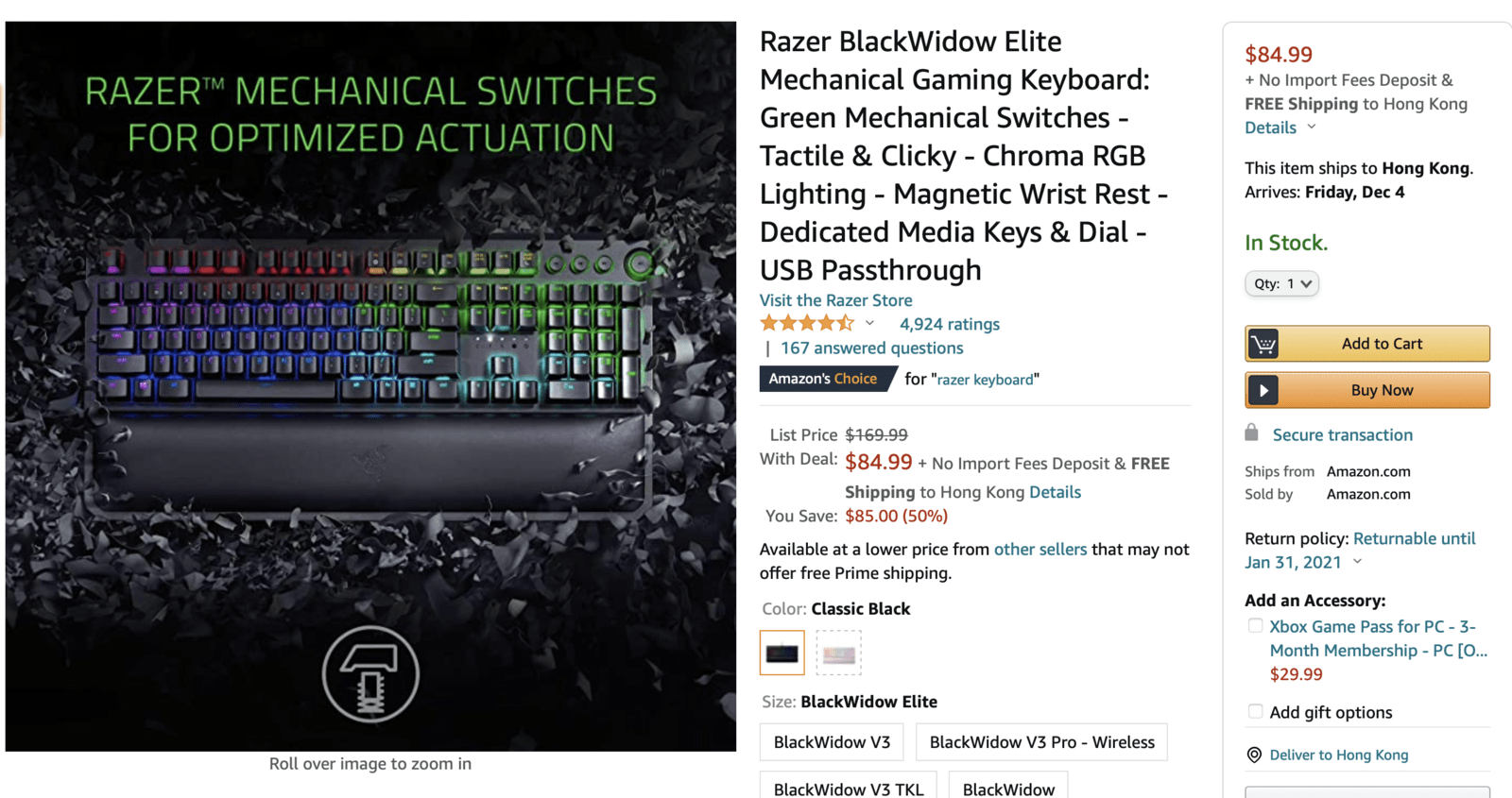 機迷有時候在 Black Friday ,亦有意外收鑊。不少大牌子的電競鍵盤及電競滑鼠等都有減價,官網原價 HK$1399,Amazon 折扣後則只需 US$ 84.99(折合約 HK$670),差不多是半價優惠,而且一件已經足夠免運費送到香港,真的非常吸引!假如讀者是 Razar 愛好者或者是想以平價購入電競機械鍵盤,這個亦是入手好選擇。不過讀者要留意只是機械式綠軸有如此便宜的優惠,其他軸式減價較少。