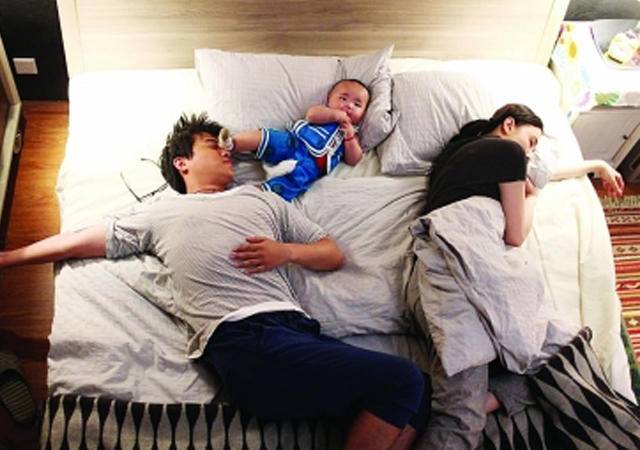 這樣的睡姿經常是半夜得醒來找找孩子,就算睡之前是在爸爸和媽媽之間的,但是寶寶睡著睡著就不知跑哪兒去了,要麼就是腳踹爸爸臉,頭枕媽媽肩,要麼就是跑床頭上,半夜摸不著孩子嚇一跳,要麼就是鑽被窩下面聞著爸媽的腳……