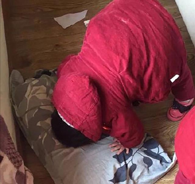 這個樣式可以說是最常見的,有的時候看著孩子是臉朝向一邊的,但是掀開被子,卻發現孩子是撅著屁股跪著睡呢。