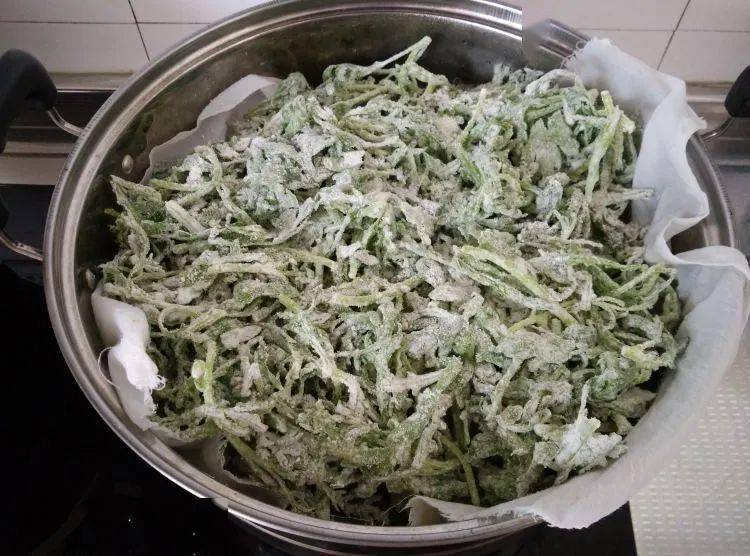 4.菜的水分被鹽腌出來了,所以不用加水啊。直接拌就行了,麵粉已經把菜包裹住了。