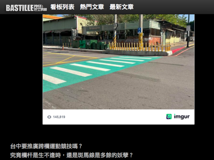 網民近日一篇「台中市政府交通局 蓋出世界奇觀」為題的帖文,成為網上熱議。照片可見一段斑馬線的盡頭,竟架了一整排的欄杆,樓主苦笑地問:「 台中要推廣跨欄運動競技嗎?」、「究竟欄杆是生不逢時, 還是斑馬線是多餘的妖孽?」