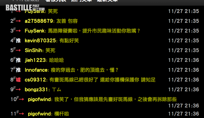 此文一出, 不少網友笑翻表示,「馬路障礙賽啦,提升市民趣味活動你敢嘴?」 、「有畫斑馬線已經很好了,還給你護欄保護你,請知足」、「 其他縣市都還沒有的貼心設計好嗎」、「要通過斑馬線是有條件的, 不是得夠瘦鑽過去,就是要能跳過」。