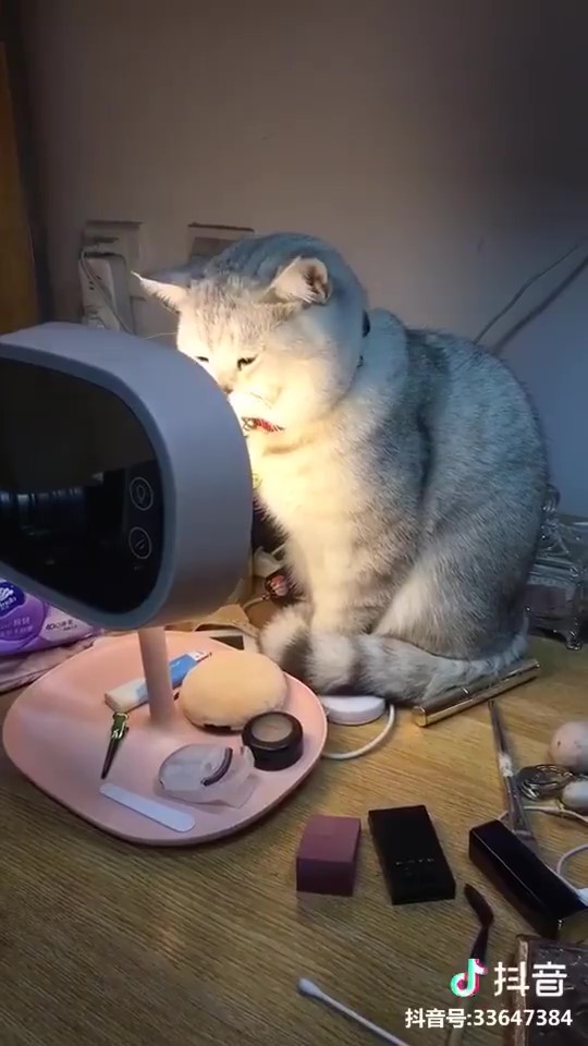 化妝燈一點都不暖和,貓咪卻還超認真又享受的一直在那裡烤,這反差萌真的太可愛了!