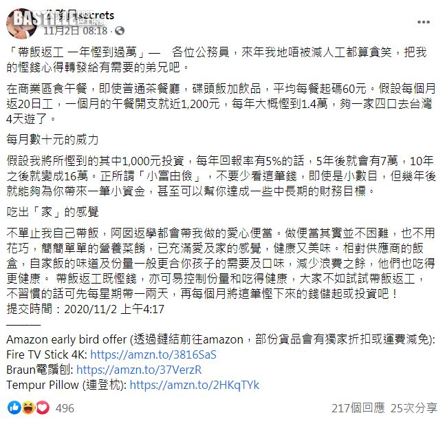 一名網民日前在「公務員secrets」中投稿,指出在商業區吃午飯價錢貴,就算是普通茶餐廳吃碟頭飯加飲品,平均每餐都要$60。他又表示:「假設每個月上班20天,一個月的午餐開支已經接近$1,200。樓主認為,如果以上的午餐全部以帶飯取代,每年大概慳到1.4萬元,足夠一家四口去台灣4天遊」。