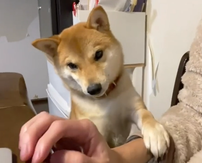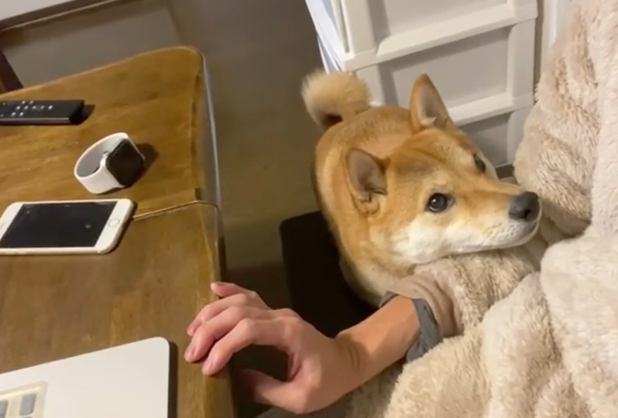 影片中只見柴柴Ringoro伸出手手搭在馬麻的手上,還露出渴望的眼神希望馬麻停下手邊的工作來摸摸牠,但主人只是摸了一下Ringoro就繼續辦公,而固執的柴柴才沒有那麼容易善罷甘休,Ringoro接下來還展開一系列的撒嬌攻擊,一下抓袖子、一下饋桃,真的是太犯規了!